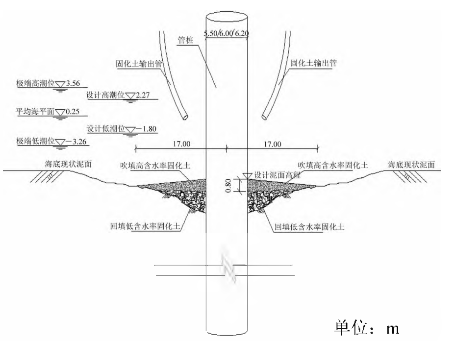 将高含水率淤泥基“聚垚”牌流态可定制抗渗稳定土直接注入桩基周围海床面,依靠可控的浆液流动性,自主流至需防护范围,可实现固化土和桩基、海床更好的贴合和融合。