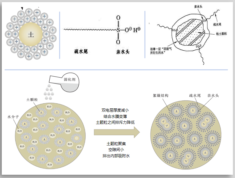 中科聚垚环保自有核心技术--聚垚土体水稳定法技术采用“聚垚”牌土壤固化外加剂(离子型)通过离子交换作用,改善了土体表面的电荷性质,使土体结构中的吸附水不可逆地游离出土壤颗粒,从而使土壤颗粒从“亲水性”变为“憎水性”。改性后的土体经过碾压后,土体中的水分被排出,土体的孔隙率和含水率减小,土体的性能指标得到有效提高,同时土体的水稳定性和耐久性得到有效改善。这种化学反应是永久性的、不可逆的,经改性后的土壤不会出现二次“泥化现象”。