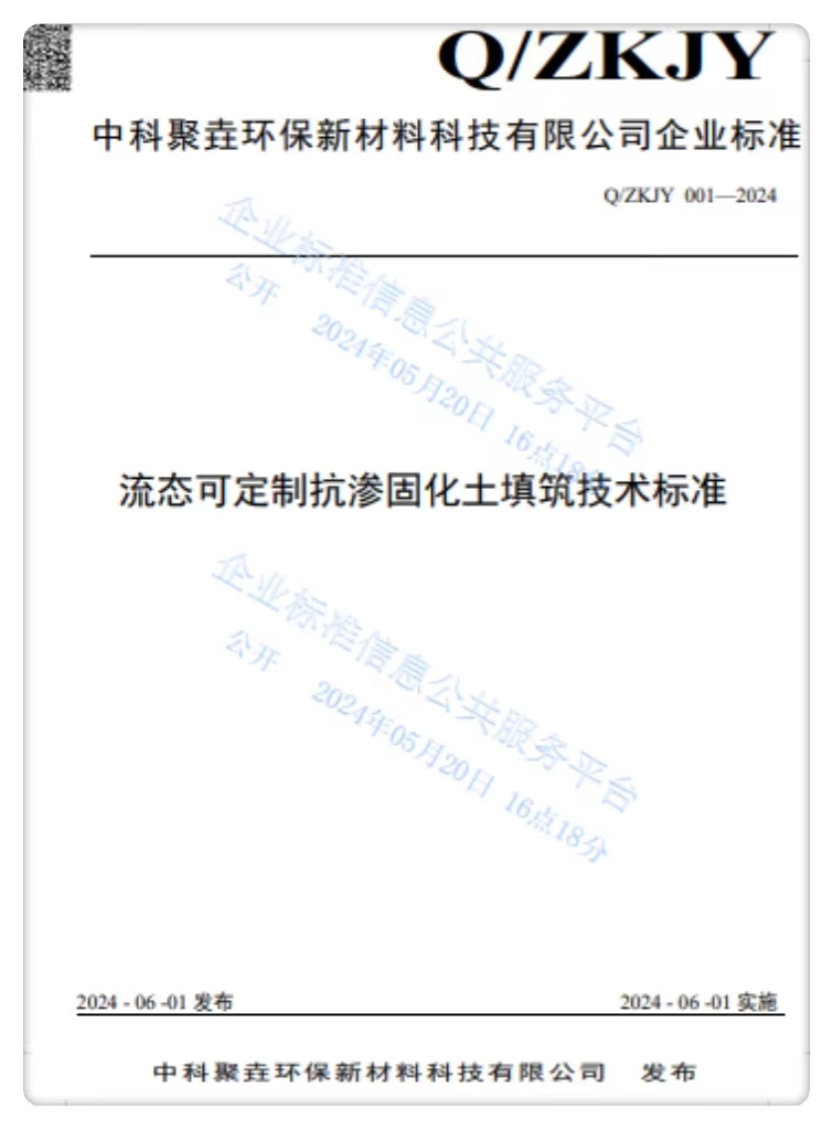此次发布的企标编号为Q/ZKJY 001-2024,即“流态可定制抗渗固化土填筑技术标准”。该标准详细规定了流态可定制抗渗固化土在填筑过程中的技术要求、性能指标、施工方法及质量控制等关键要素,确保材料在实际应用中能够达到预期效果,同时保障施工安全和环保要求。
