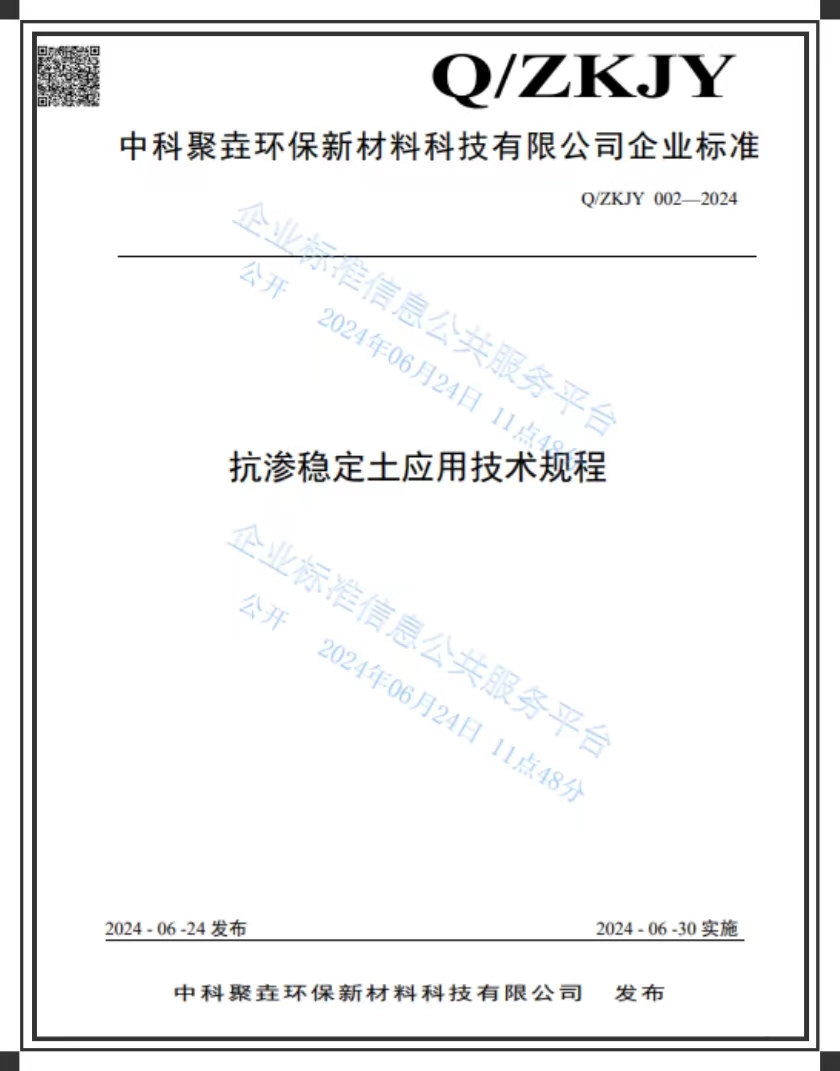 2024年6月24日,中科聚垚环保新材料科技有限公司以其前瞻性的研发实力和深厚的技术底蕴,正式对外发布了全新企业标准——“抗渗稳定土应用技术规程”。此项企业标准的编号为Q/ZKJY 002-2024,标志着中科聚垚在环保新材料领域的又一次重大突破。